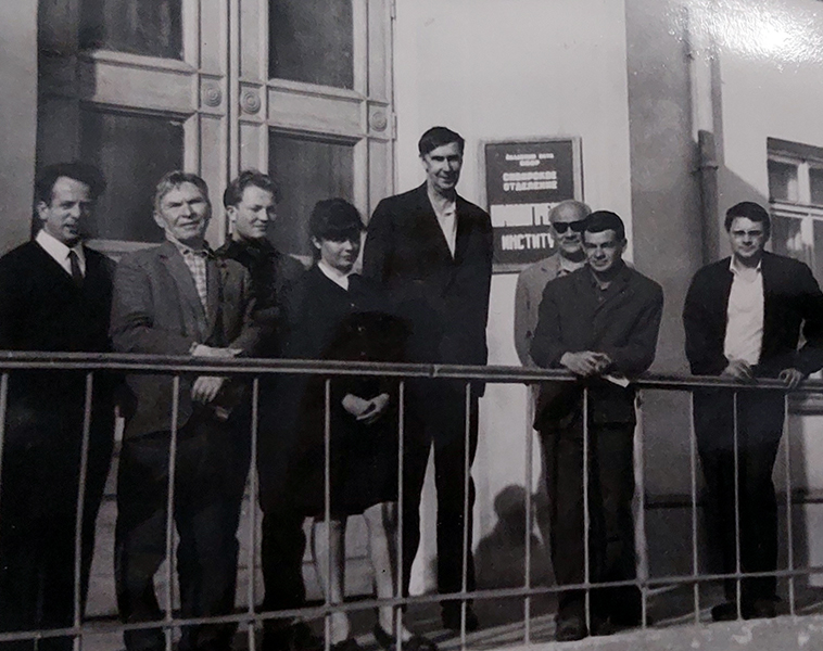 На крыльце Лимнологического института СО АН СССР. Слева направо В.Д. Пастухов, Е.А. Коряков, В.В. Смирнов, Н.С. Смирнова-Залуми, Г.В. Никольский, Б.К. Москаленко, И.П. Шумилов, Ж.А. Черняев. 1967 г.