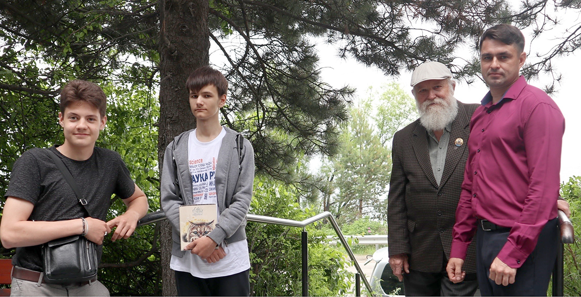 В.В. Смирнов, Р.Ю. Чебунин (учитель биологии школы № 24), Е. Гамаюнов и Ф. Швец (ученики школы № 24 г. Иркутска) возле Байкальского музея во время подготовки к докладам. Лето 2022 г.