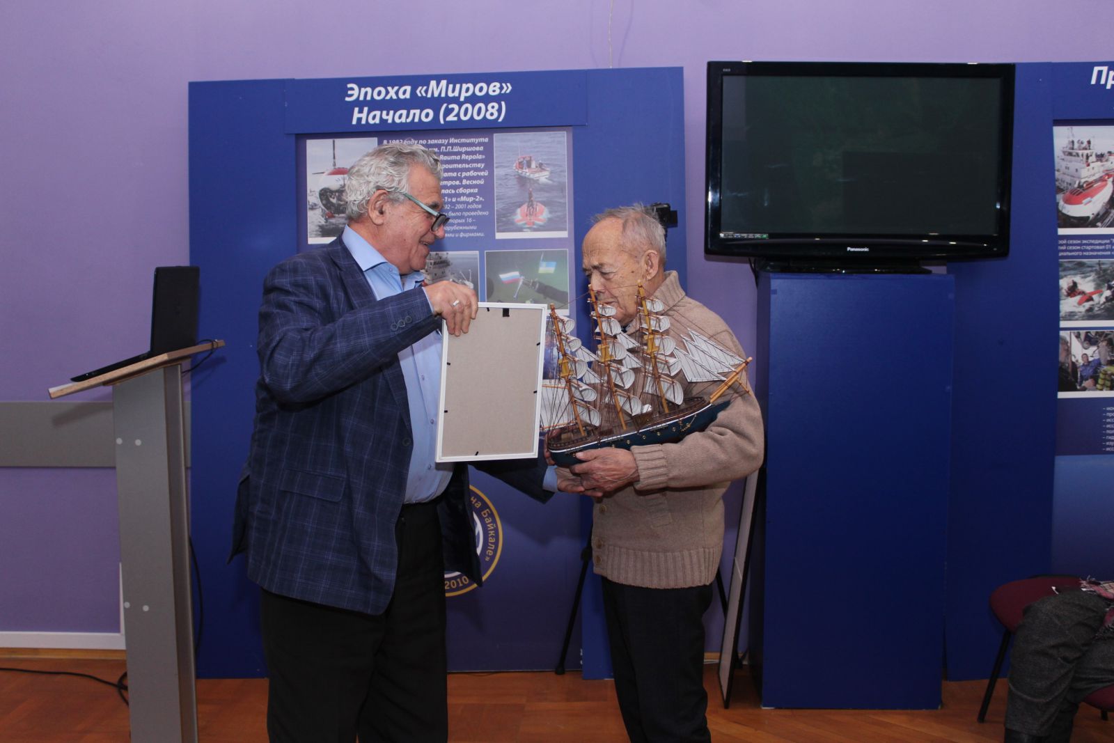 После научной сессии выступил доктор географических наук, главный научный сотрудник Института географии им. В.Б. Сочавы Л.М. Корытный, отметив участие М.Н. Шимараева в работе географического общества и вручил юбиляру очень символический географический подарок – модель парусного судна.