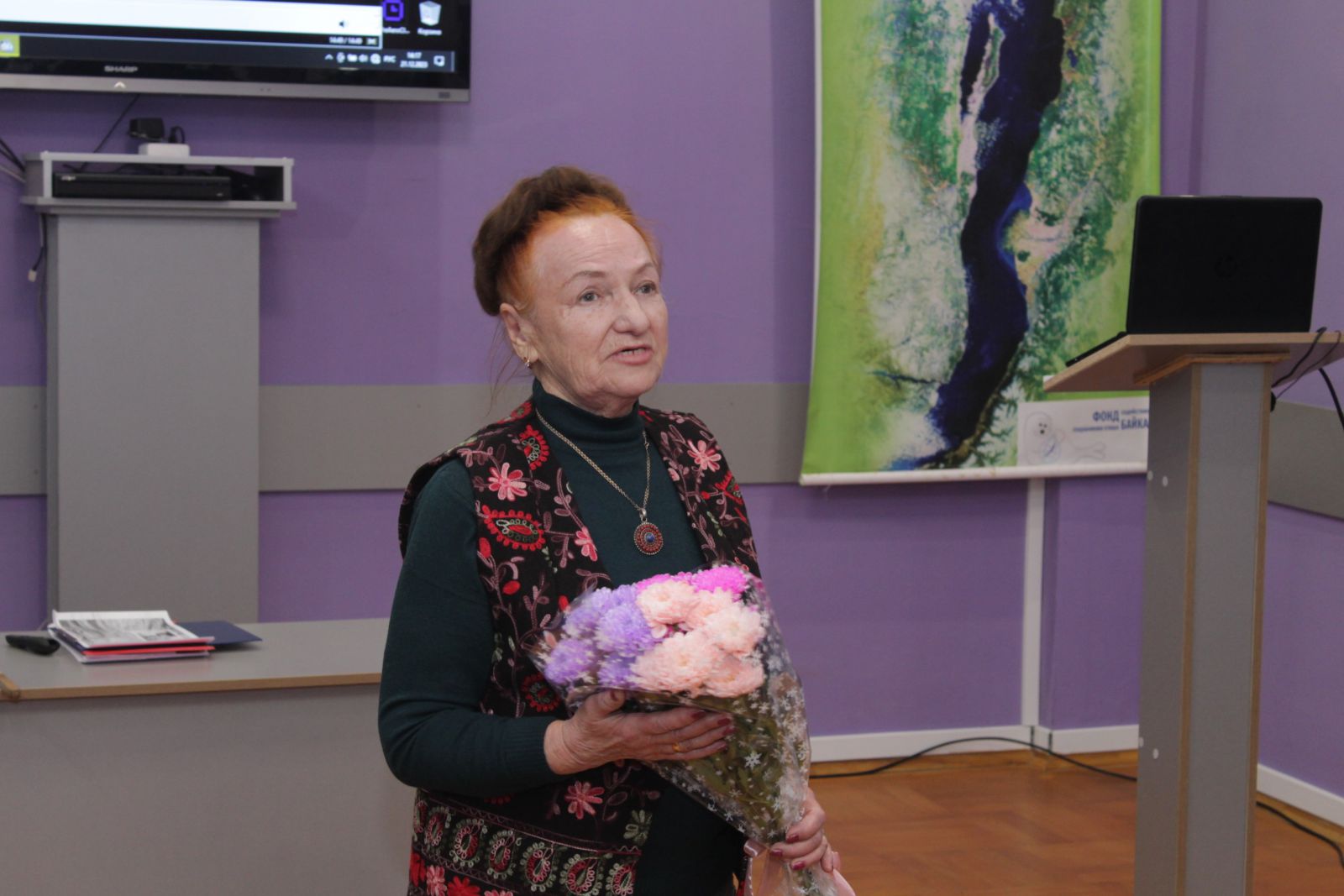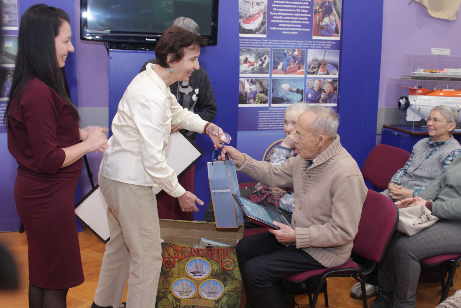 Затем были поздравления и вручение подарков Института наук о Земле СПбГУ, Байкальского музея, Географического факультета ИГУ, В.Г. Сиделевой и учеников М.Н. Шимараева.