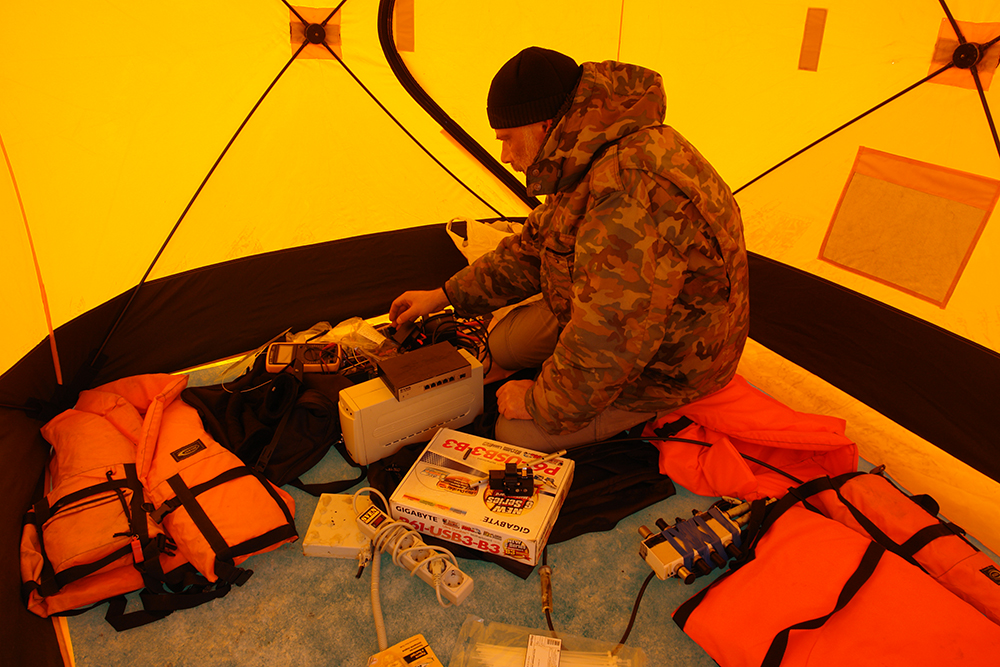 В палатке на льду работает инженер.
