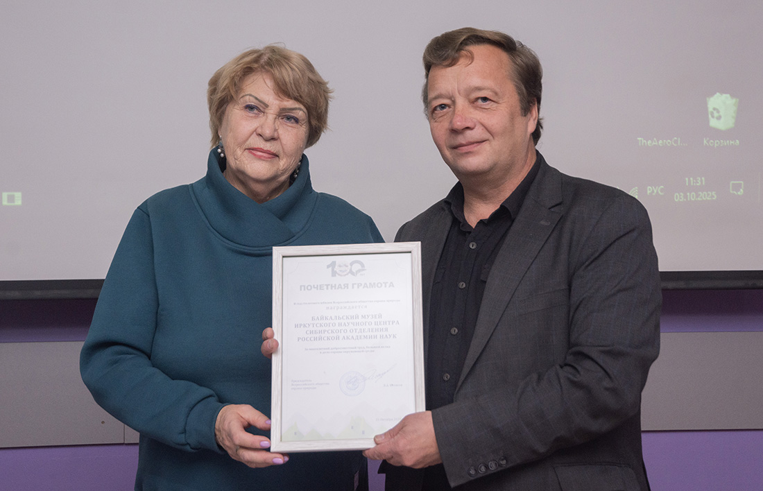 3 октября в Байкальском музее состоялось открытие XIV детско-юношеского форума общественного водоохранного движения «Чистые воды Прибайкалья». Главным организатором форума является Иркутское отделение Всероссийского общества охраны природы (ВООП). Председатель Иркутского отделения ВООП Вера Михайловна Шленова вручила директору Байкальского музея Александру Борисовичу Купчинскому Почетную грамоту за многолетний добросовестный труд и большой вклад в дело охраны окружающей среды.